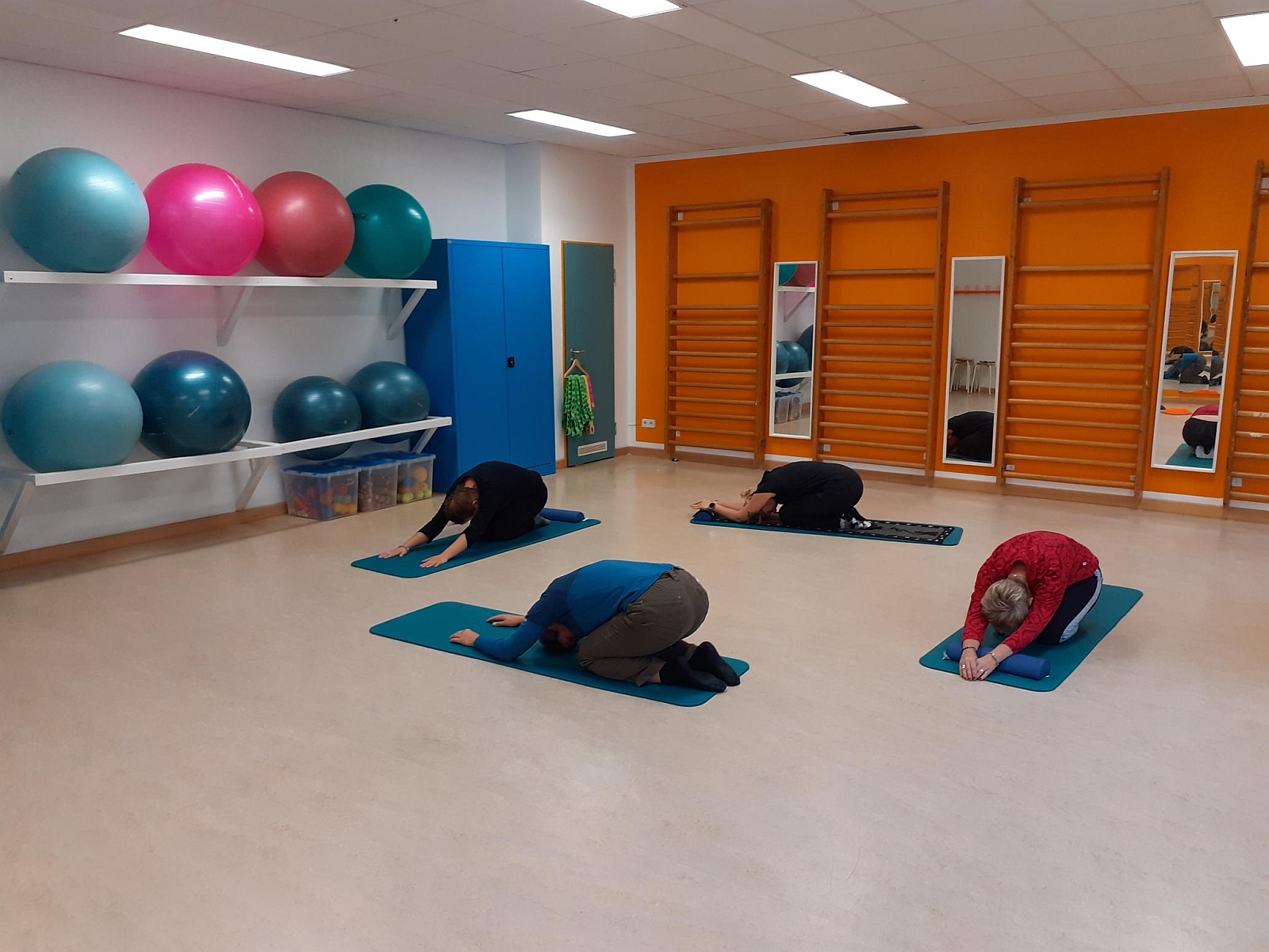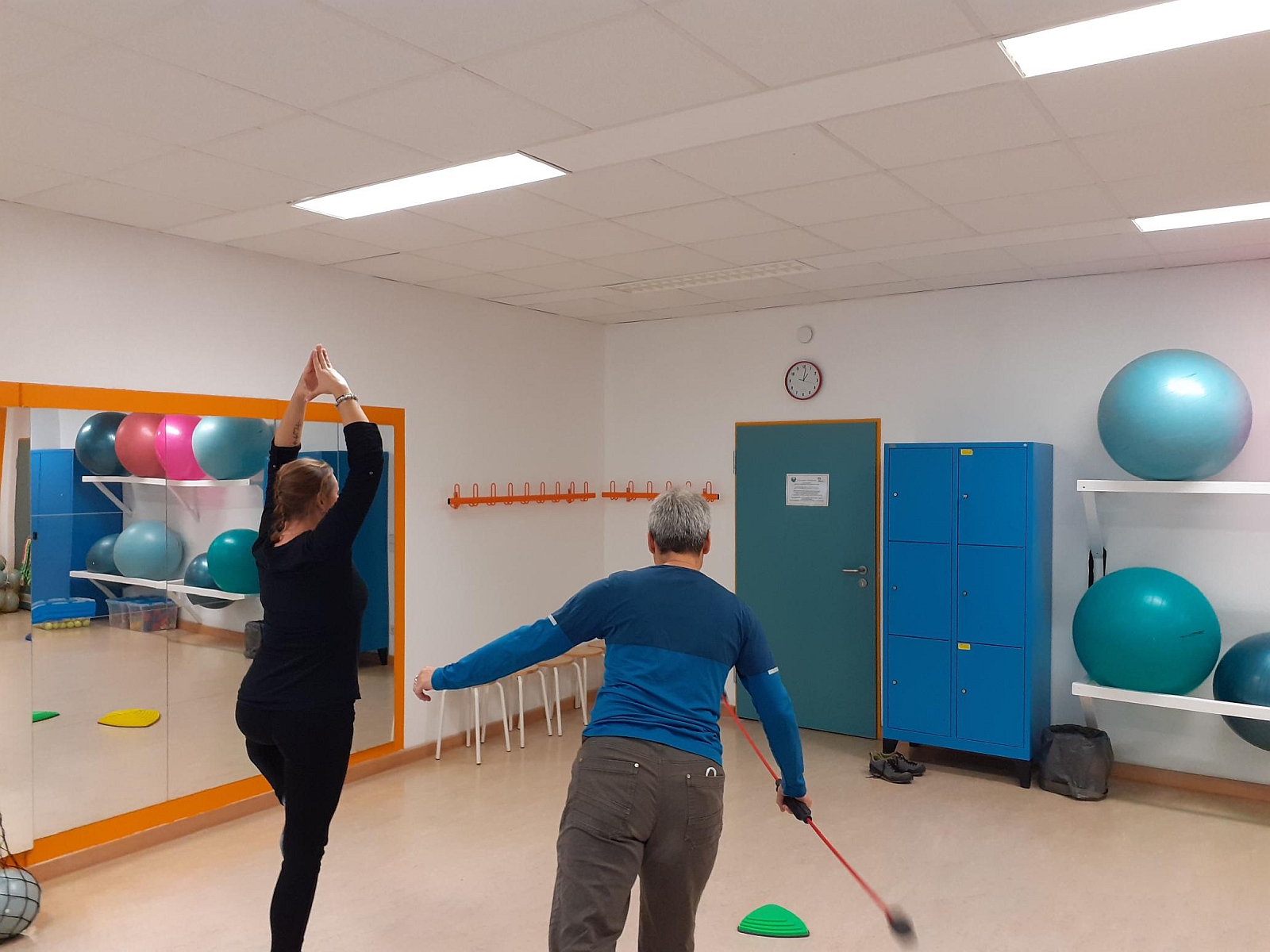 Der Raum wurde komplett renoviert, die bestehenden Sprossenwände wurden mit neuen Spiegeln komplettiert und auch eine weitere Wand ist mit Spiegeln versehen. Dies hilft den Nutzer*innen entsprechende Übungen korrekt zu trainieren, Fehlerquellen festzustellen und zu korrigieren.
