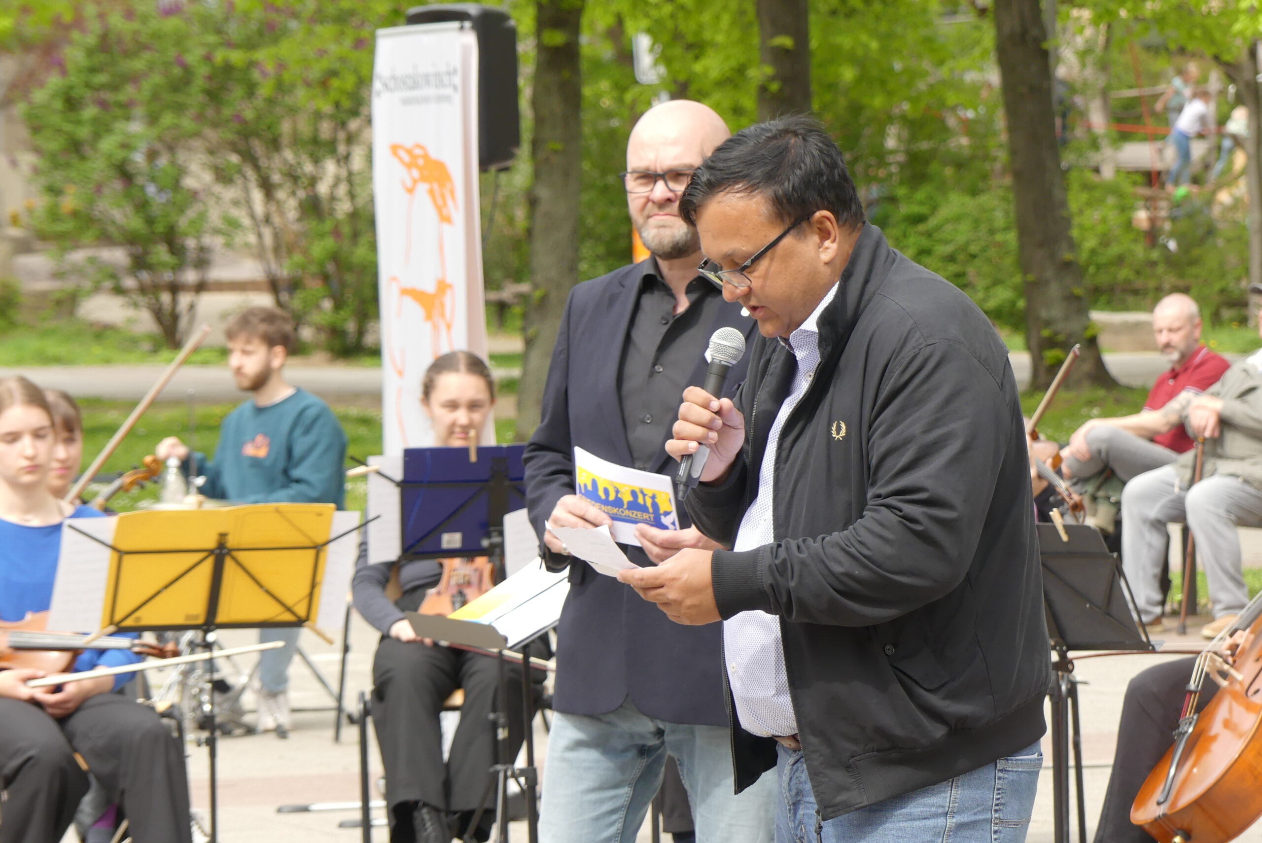 Der Berliner Anton-Saefkow-Platz war Veranstaltungsort des Friedenskonzertes mit Spendenaktion für Geflüchtete aus der Ukraine. Auf dem Programm standen moderne und klassische Werke, gespielt vom “Schostakowitsch-Sinfonierorchester”, der “Rythm & Melodie Conzertband”, dem Ensemble “Der 3. Trommelstock” sowie Lichtenberger Chören.